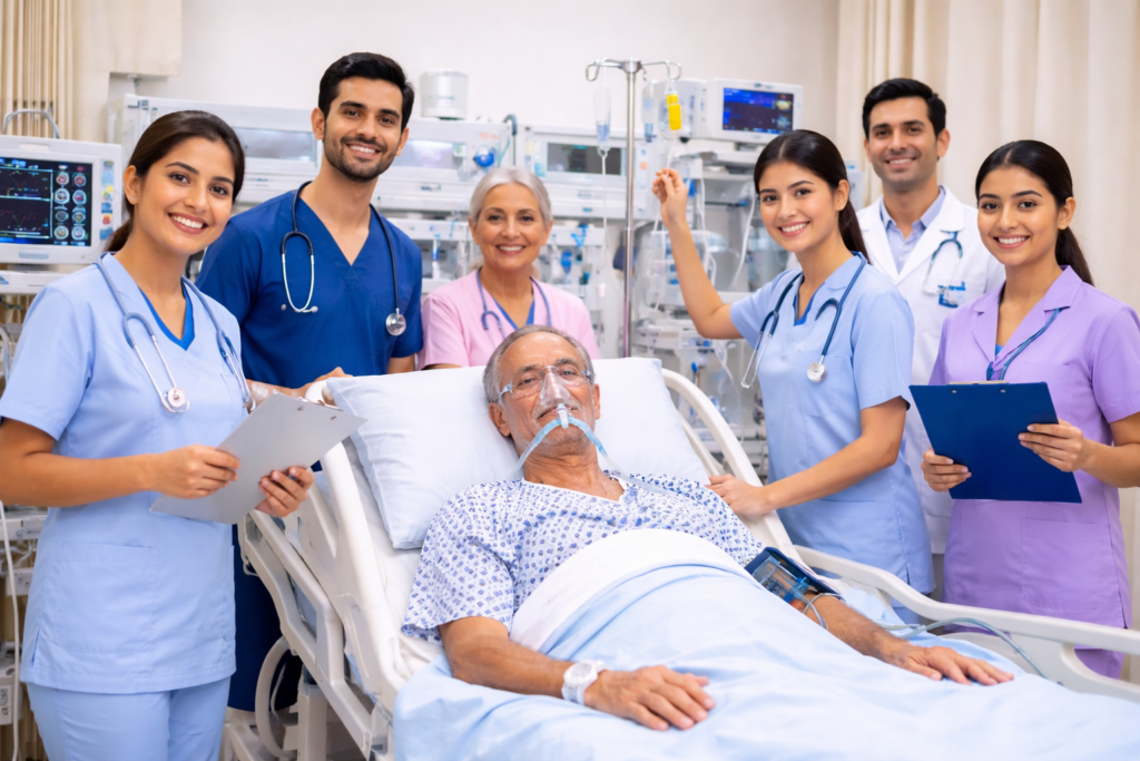 ICU Setup at Home – Advanced medical setup with equipment and trained staff for critical care at home.